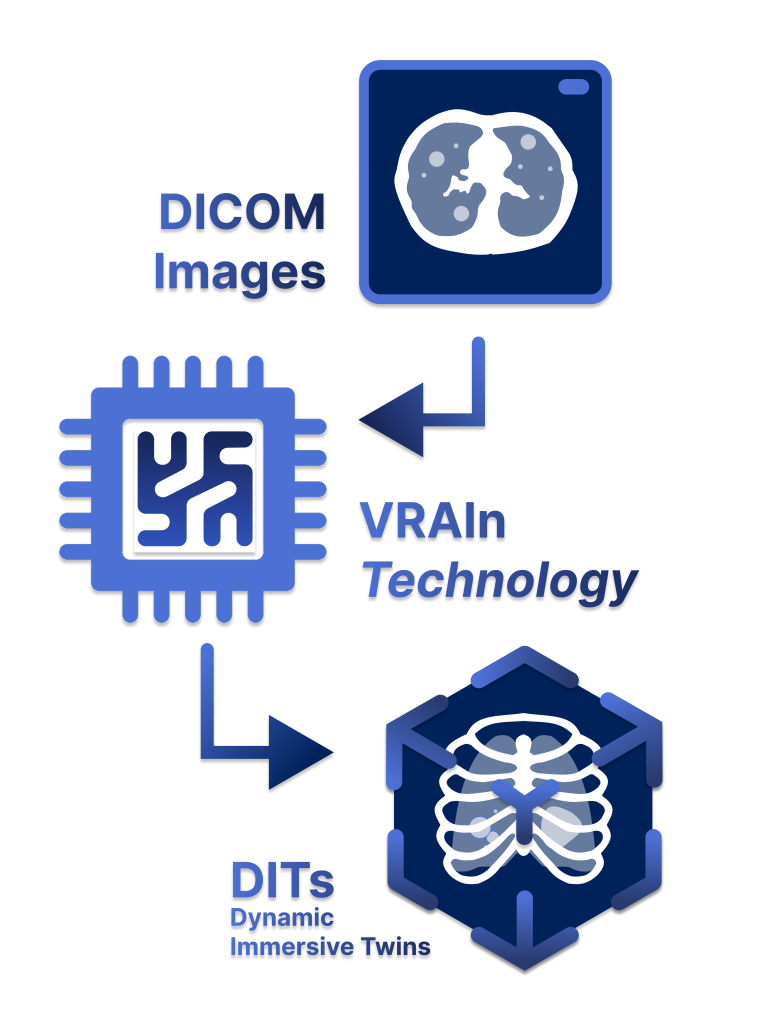 A Digital Immersive Twin (DIT) is the result of our proprietary VRAIn technology, which transforms a flat DICOM file into a data-rich, fully interactive, multidimensional replica of a patient’s unique anatomy.